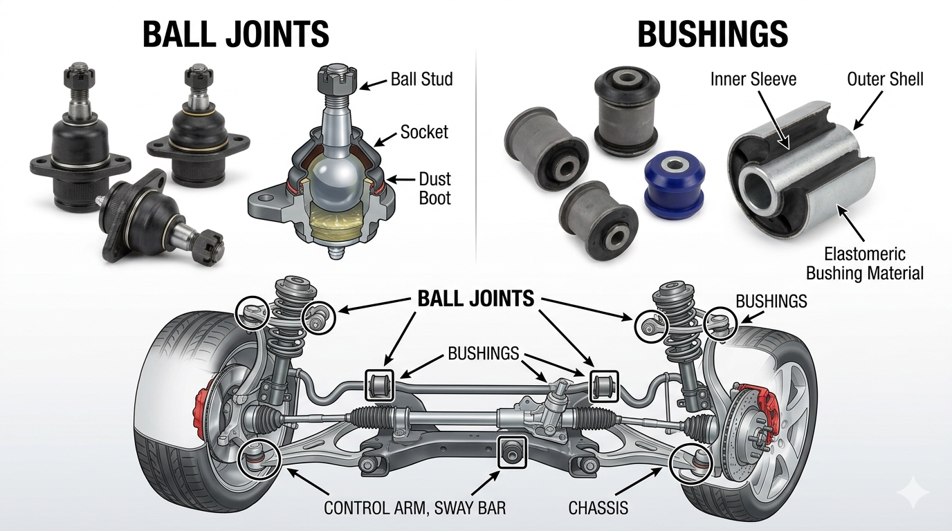 Partea practică: inspectați articulații sferice și bucșe la fiecare rotire a anvelopei (la fiecare 5.000–7.500 de mile), înlocuiți componentele uzate în perechi de axe, urmați întotdeauna lucrările de suspensie cu o aliniere pe patru roți și alegeți calitatea componentelor care se potrivește cu cazul de utilizare al vehiculului dvs. - cauciuc OEM pentru șoferii zilnici orientați spre confort, poliuretan pentru aplicații de performanță sau sarcini grele.